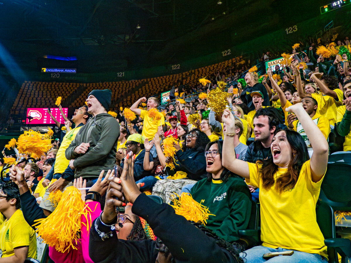 Throughout the arena, students laughed, cheered, and snapped photos as music filled the stands. For Zoe Oliver, a junior majoring in government and vice president of marketing and public relations for Student Government, it marked her third Gold Rush, and her favorite George Mason tradition.